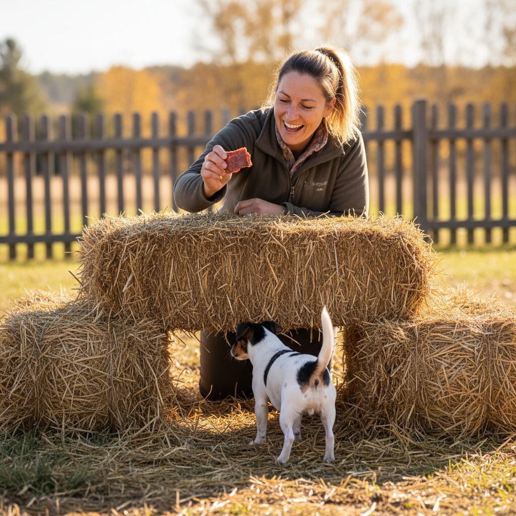 - The Climb: Begin by encouraging your dog to put their front paws up on a low, stable hay bale. Reward this behavior heavily. Progress to asking them to jump up with all four paws. Ensure the bales are secure and won’t wobble to build your dog’s trust.