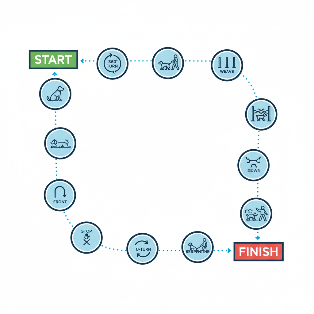 Expert Tip: When practicing, focus on one or two new signs per session. Start by ‘walking’ the course yourself without your dog to learn the pattern. Then, guide your dog through slowly, using treats to lure them into the correct positions if needed. Gradually fade the lures as your dog begins to understand the exercises.