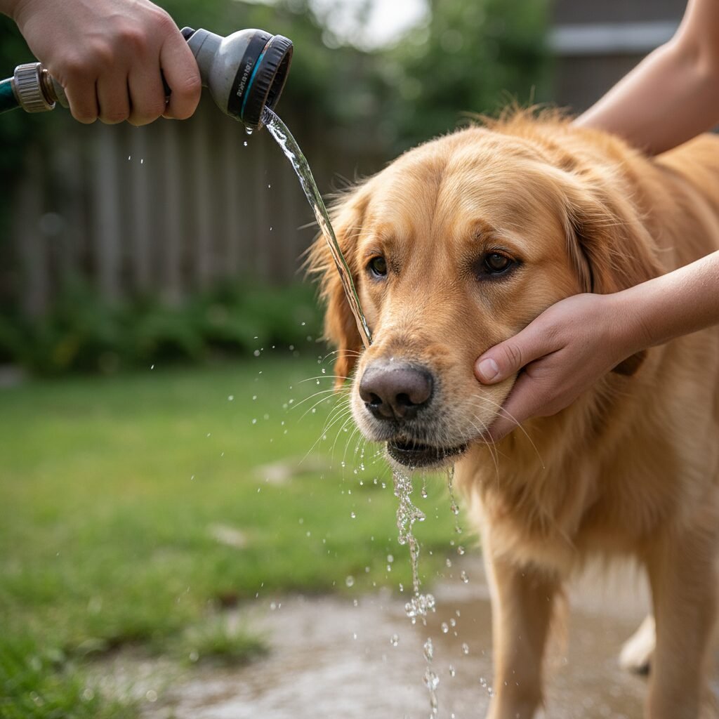 If possible, use a garden hose with low pressure or a faucet sprayer to rinse the dog’s mouth. CRITICAL: You must point your dog’s head downward and forward, so the water flows out of the mouth and is not swallowed. Swallowing the water will introduce the toxin into the gastrointestinal tract, worsening the poisoning. Rinse for 5-10 minutes.