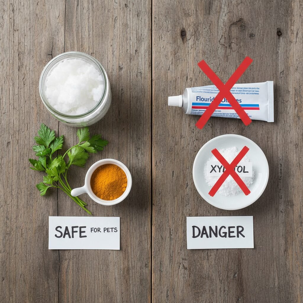 Coconut Oil: Contains lauric acid, which has natural antibacterial and anti-inflammatory properties that help reduce plaque-causing bacteria. Xylitol: An artificial sweetener that is extremely toxic to dogs. It can cause a rapid, life-threatening drop in blood sugar (hypoglycemia) and liver failure.