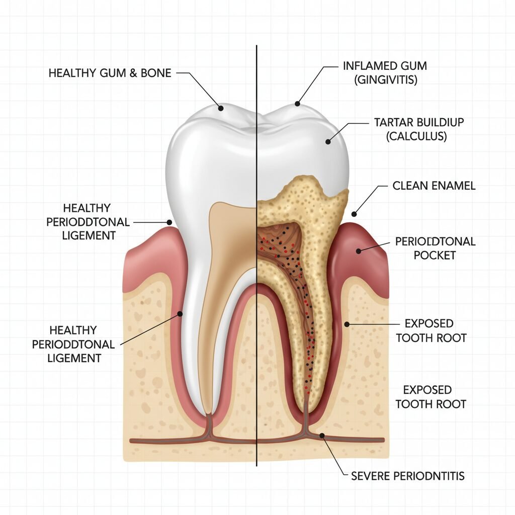 • Loose Teeth: This is a sign of advanced periodontal disease and significant bone loss.