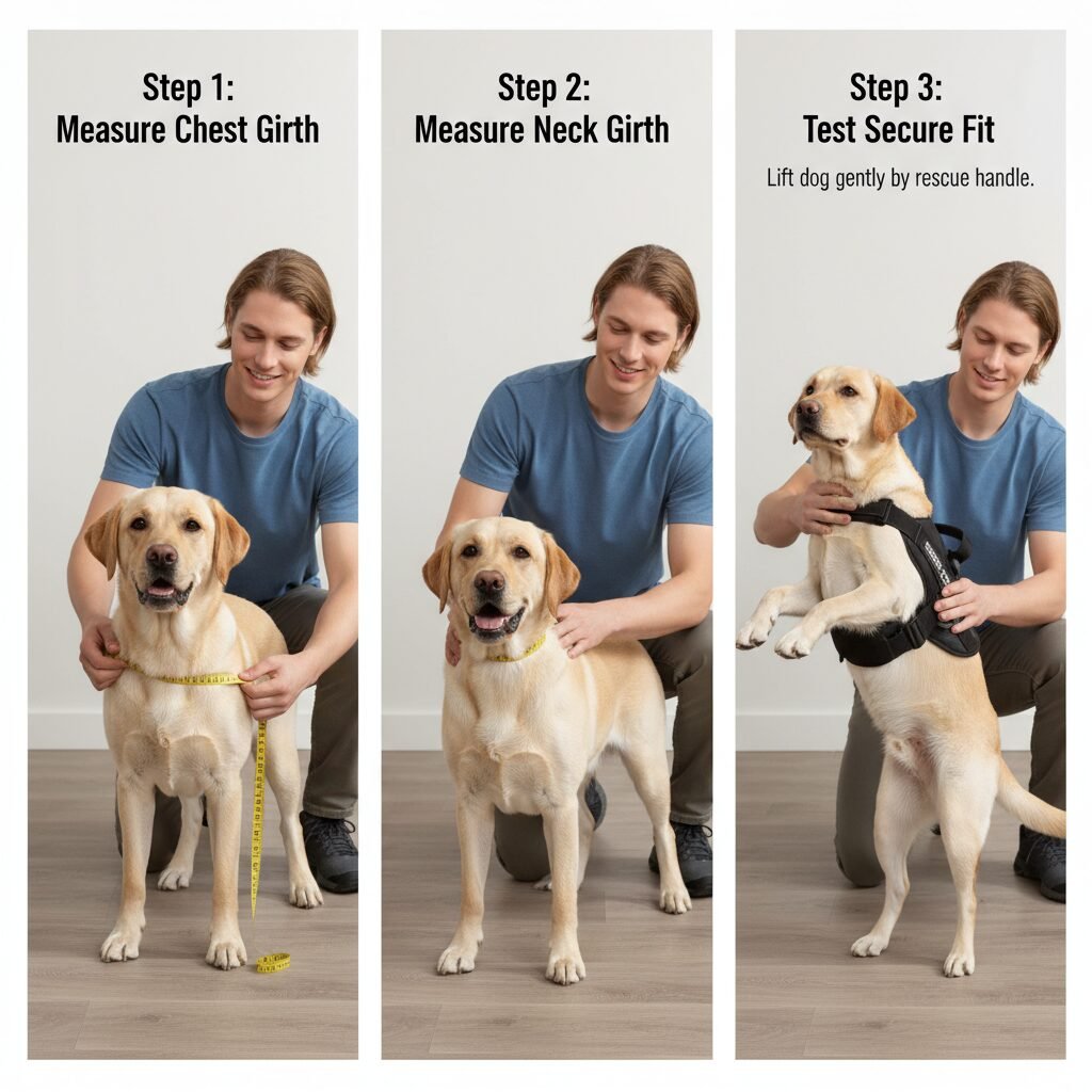 - Lift Test: Briefly and gently lift your dog by the rescue handle. The vest should support their weight without the dog slipping out. Their body should be lifted evenly.