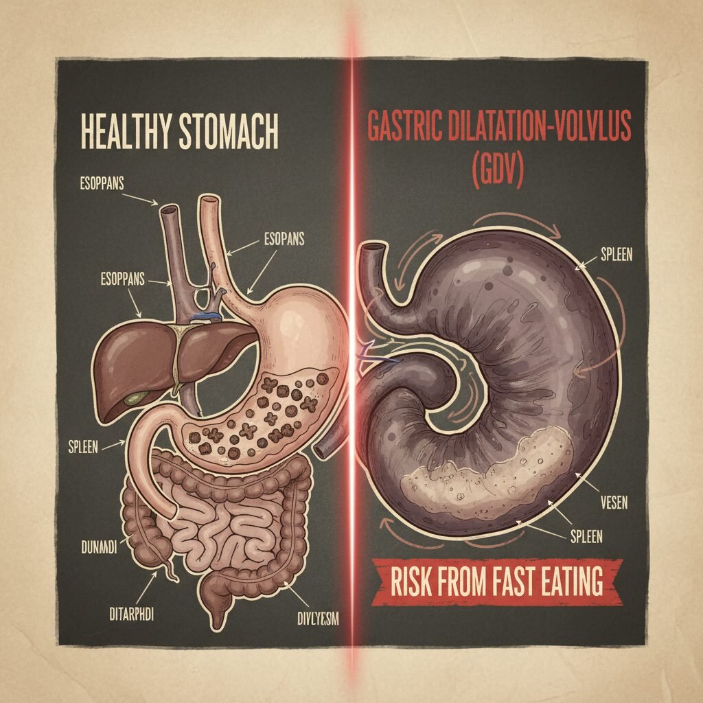 This is the most severe risk associated with rapid eating. GDV is a two-stage, life-threatening condition. First, the stomach fills with gas, causing it to dilate or ‘bloat.’ In the second, more critical stage, the gas-filled stomach twists on its axis (volvulus), cutting off blood flow to the stomach and spleen and blocking the exit of gas and food. This is an extreme medical emergency where every second counts.