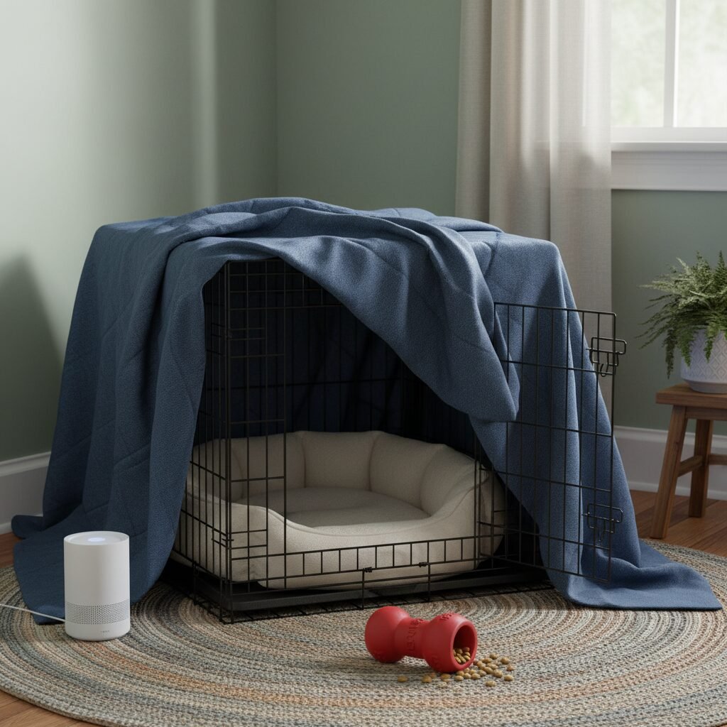 - A Crate or Den: If your dog is crate-trained, their crate is the perfect centerpiece. Cover it with a heavy blanket or sound-dampening cover to create a dark, cozy den.