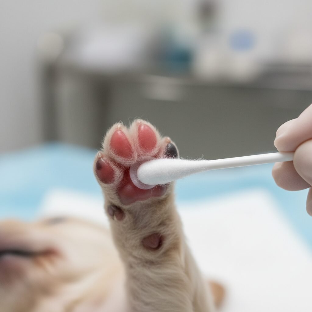 Procedure: Holding the puppy in one hand, gently stimulate the sole of one paw with a cotton swab or similar soft object. It is not necessary to see the puppy react. The simple act of the nerve endings registering the sensation is sufficient.
