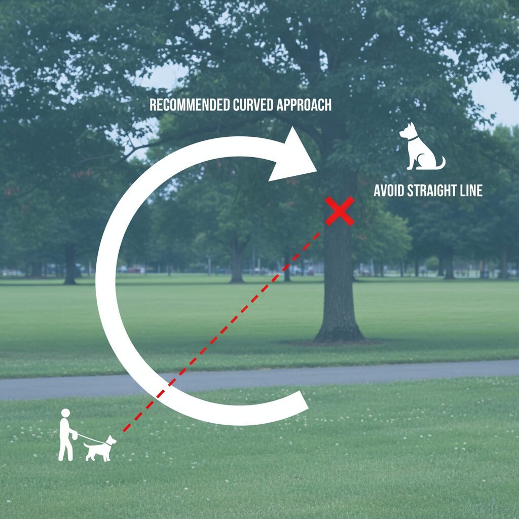 Dogs in the wild rarely approach each other head-on; direct eye contact and frontal approaches are rude and threatening in canine body language. We must mimic natural greeting curves.