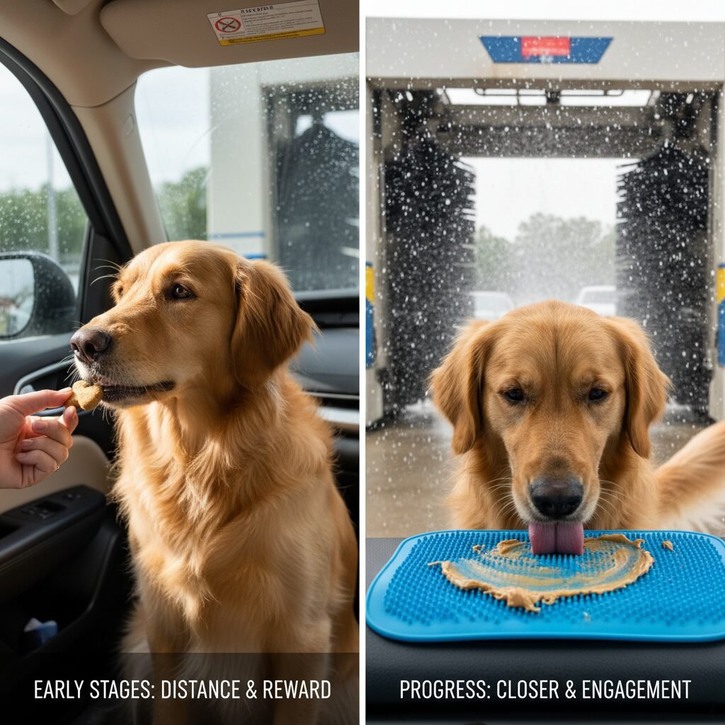Over several sessions, gradually decrease the distance. Move the car one or two parking rows closer. Watch your dog’s body language carefully for signs of stress (panting, yawning, whale eye). If you see stress, you’ve moved too quickly. Move back to the last successful distance. Continue the pattern of rewarding calm behavior in the presence of the car wash. The sounds will get slightly louder, but the positive reinforcement should keep the experience pleasant.