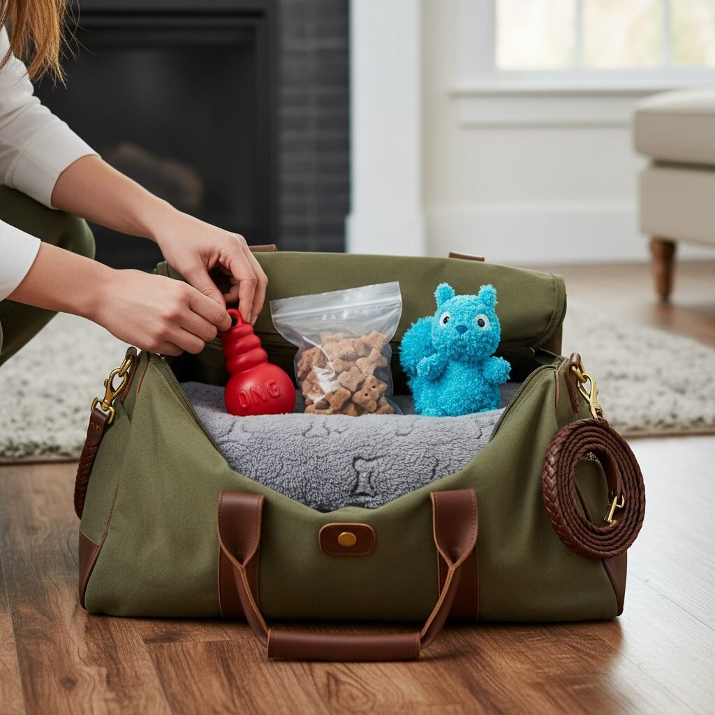 - Pack a ‘Calm Kit’: Your dog’s suitcase is as important as yours. Pack familiar items that provide comfort and engagement: their bed, a favorite blanket, puzzle toys (like a Kong), long-lasting chews, and a portable water bowl.