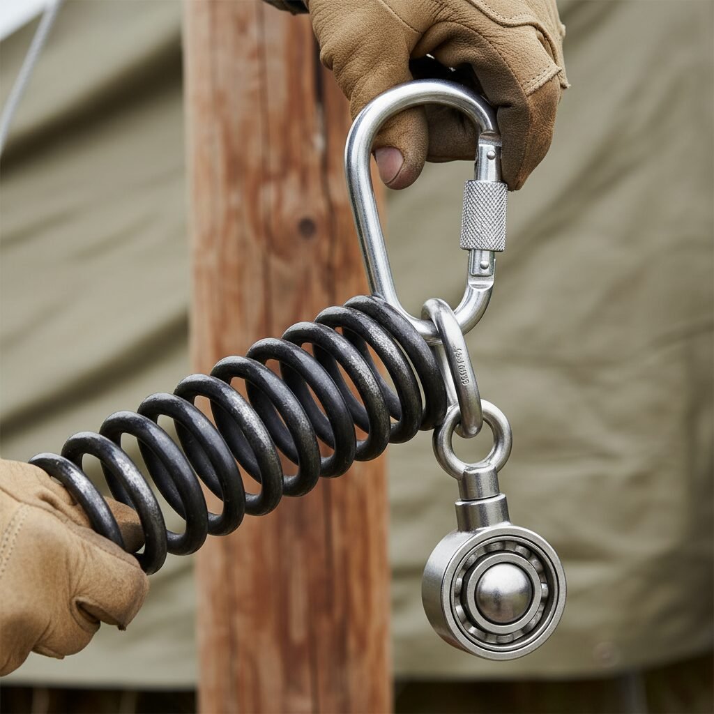 - Assemble the Core Components: This is the sequence of your hardware. Attach a locking carabiner to your anchor point (either the strap or the eye bolt). Connect this carabiner to one end of your heavy-duty spring. Attach the other end of the spring to your swivel. Finally, attach the other side of the swivel to your second locking carabiner. This sequence—Anchor -> Carabiner -> Spring -> Swivel -> Carabiner—is critical for safe and effective motion.