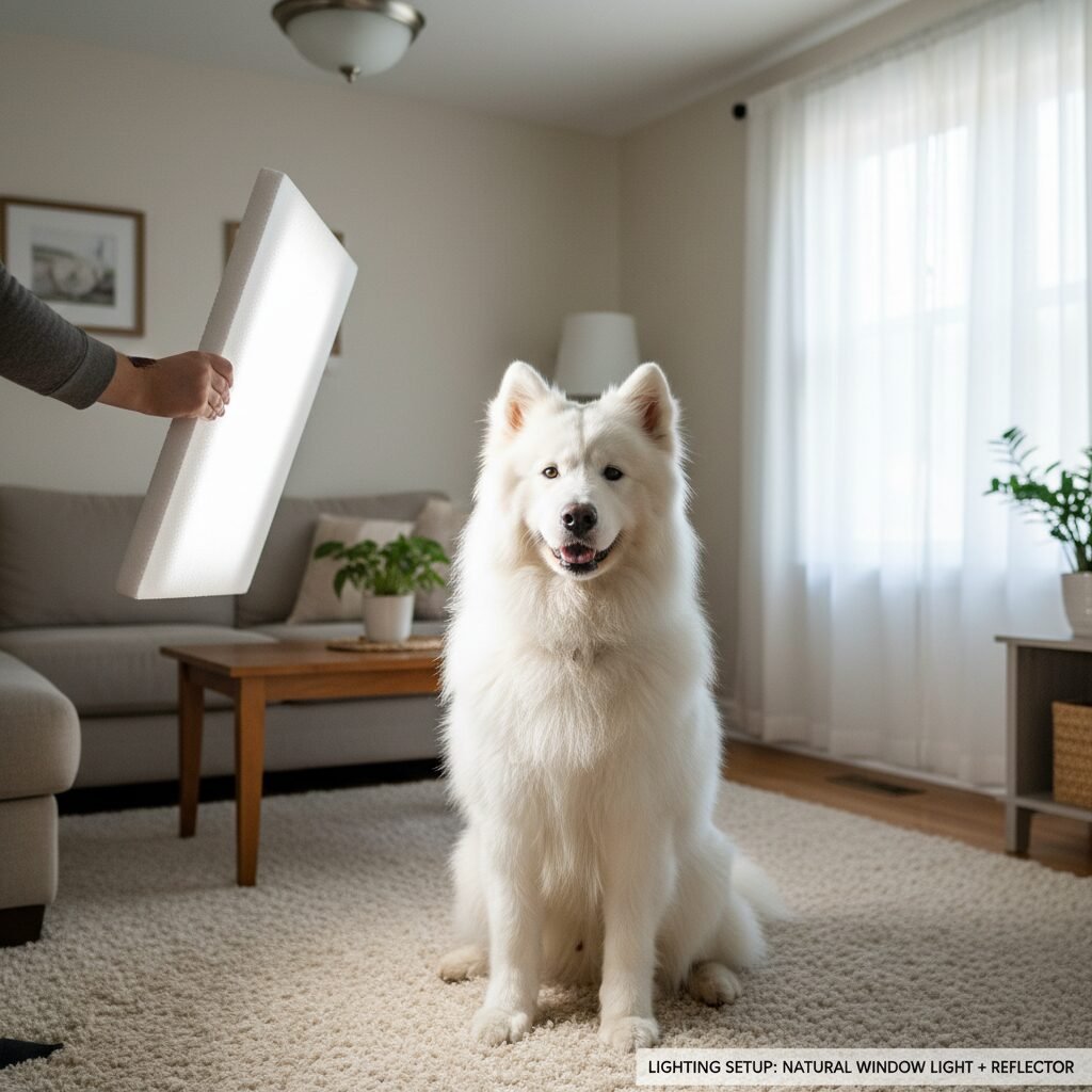 Expert Tip: Turn off all other lights in the room (lamps, overhead lights). These often have a different color temperature (e.g., warm yellow) than your primary light source (daylight is cool blue), which can result in strange and unflattering color casts on your dog’s fur. Stick to one type of light for a clean, professional look.