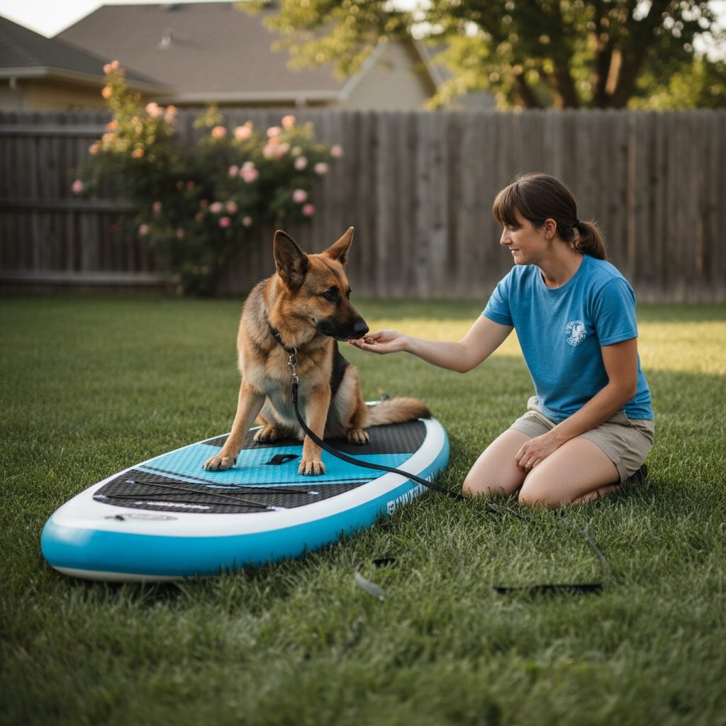Place the paddleboard in a familiar, neutral area like your backyard or living room. Let your dog investigate it on their own terms. Do not force them onto it. Reward any curiosity—a sniff, a touch with their nose, or placing a paw on the board—with praise and a high-value treat. Keep these initial sessions short and positive, ending before your dog loses interest.