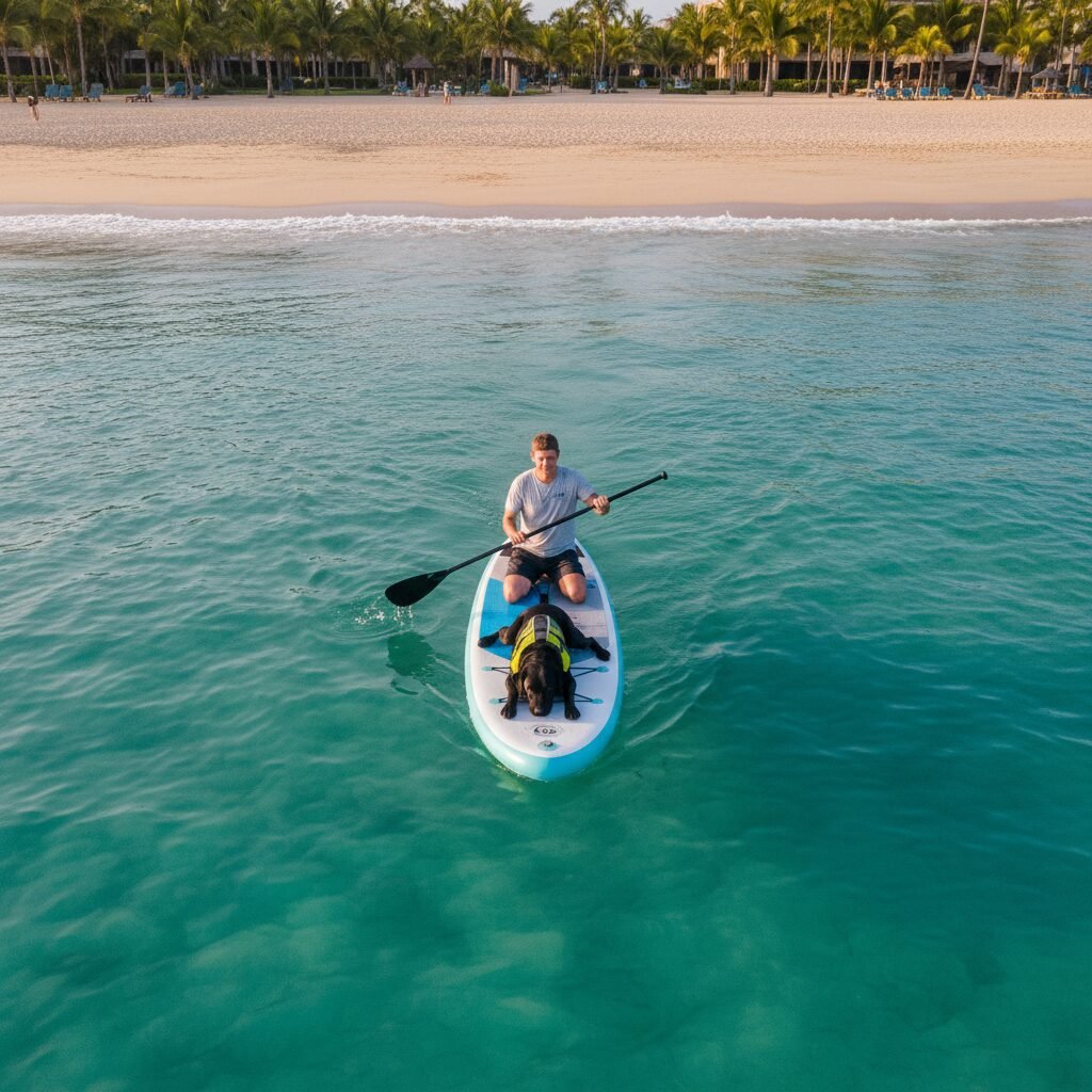 - Push Off and Paddle: Once you are both settled, use your hands or paddle to push away from the shore. Begin paddling from your knees. Standing up can be introduced later once your dog is a seasoned pro.