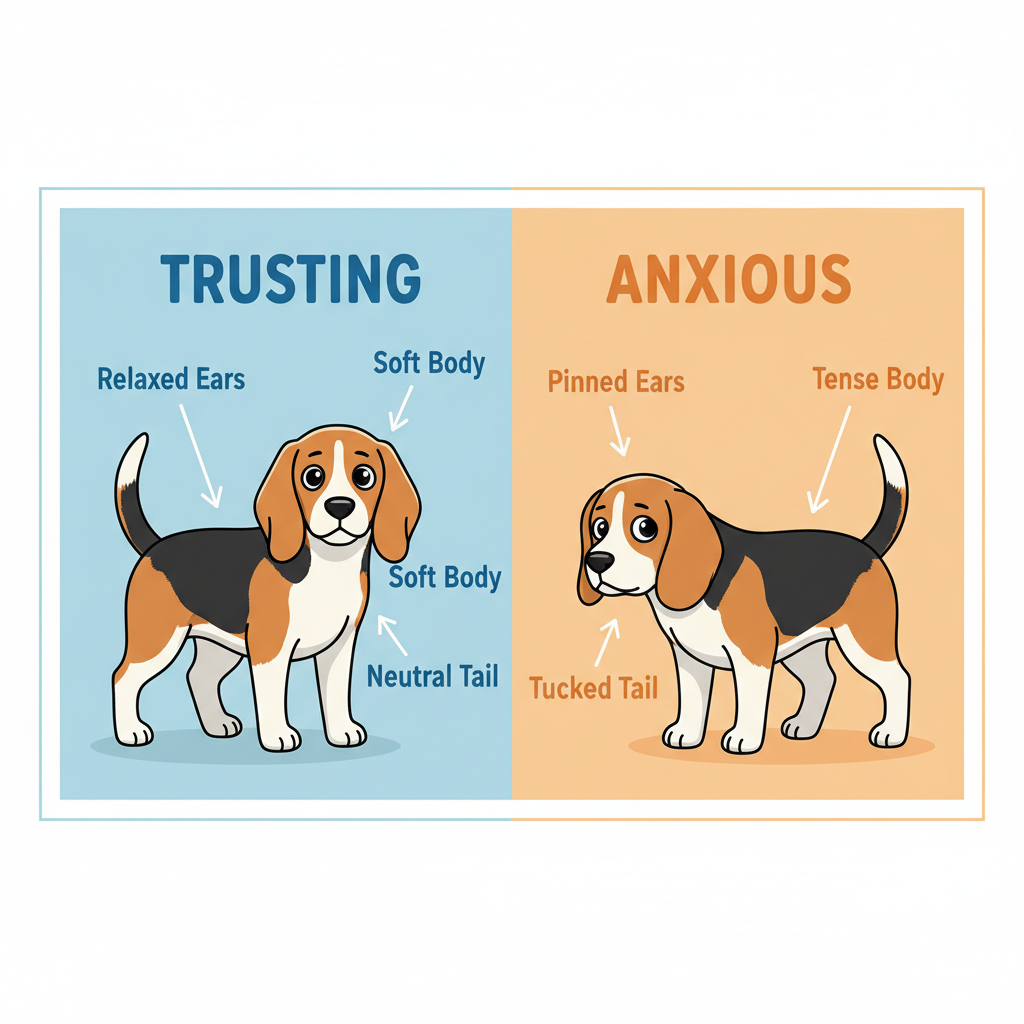 | Tail | Neutral position or a slow, sweeping wag | Tucked under or held high and stiff |