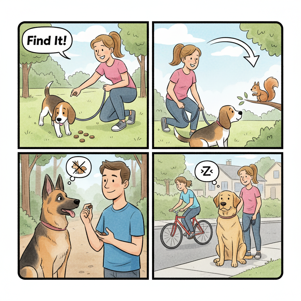 - Deploy the ‘Find It’ Game: Once you are stationary, this is the perfect time to scatter treats on the ground. This immediately redirects their brain and energy downwards into a calming, sniffing activity. It is the most effective way to break the cycle in the moment.