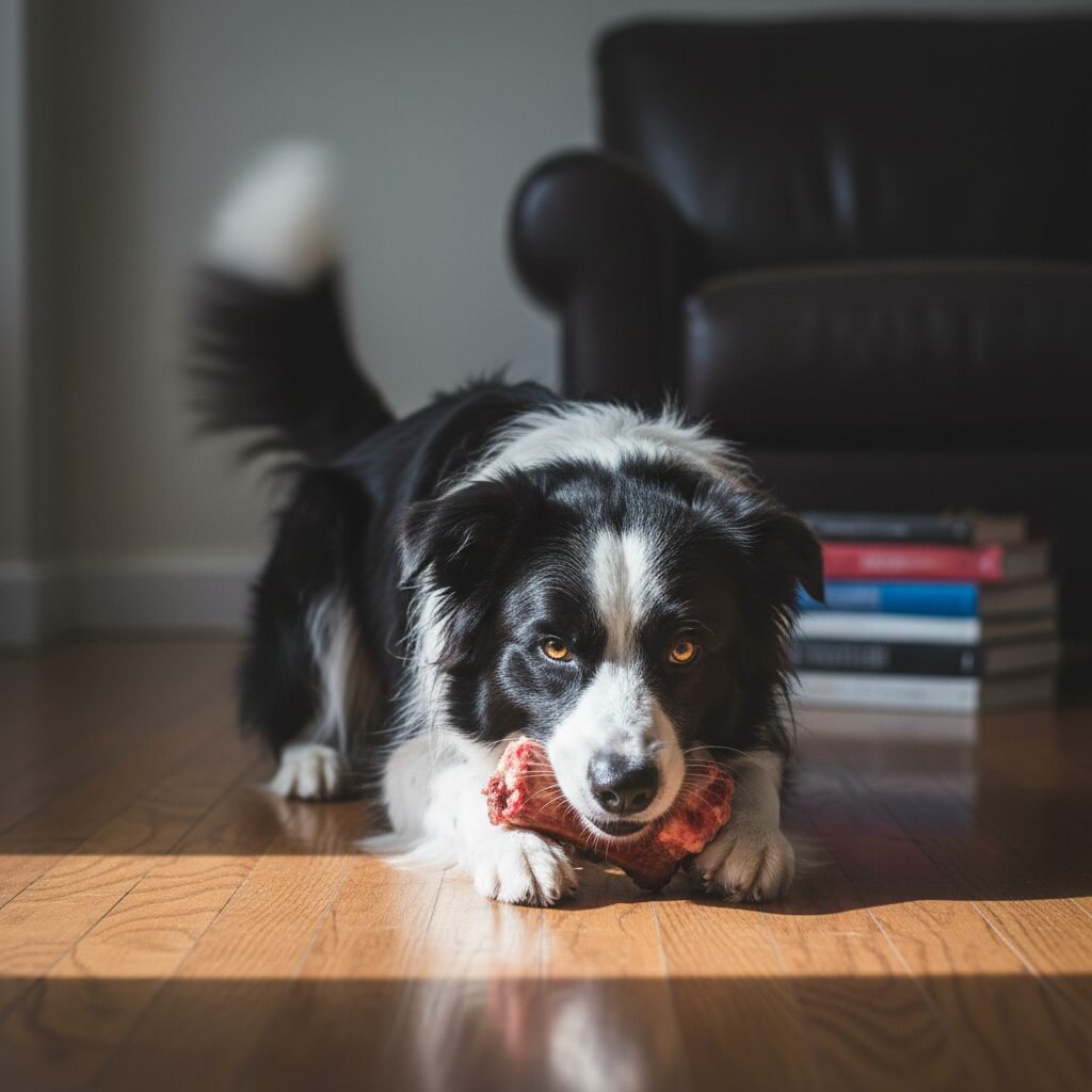 A dog is chewing a high-value bone. As you approach, its body stiffens, it gives you a hard stare, and its tail begins to wag in a high, stiff, rapid motion. This is not a happy wag. The dog is aroused and anxious about its resource. The wag is a signal of conflict and a clear warning: ‘This is mine. Do not come closer.’ Ignoring these combined signals and reaching for the bone is a common cause of household dog bites.