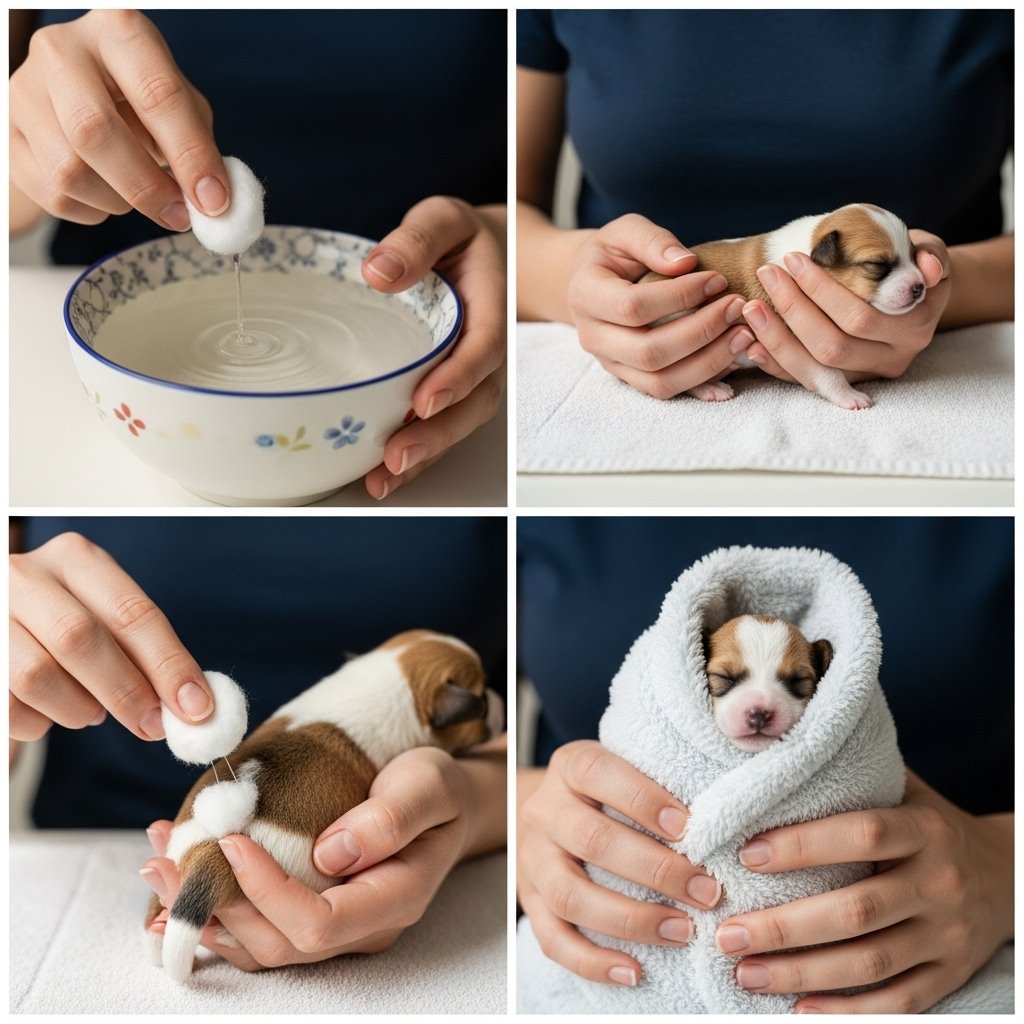 Wash your hands thoroughly. Place a clean towel or puppy pad on a stable surface. Dip a cotton ball or a corner of a soft cloth into the warm water, squeezing out any excess. It should be damp, not dripping wet.