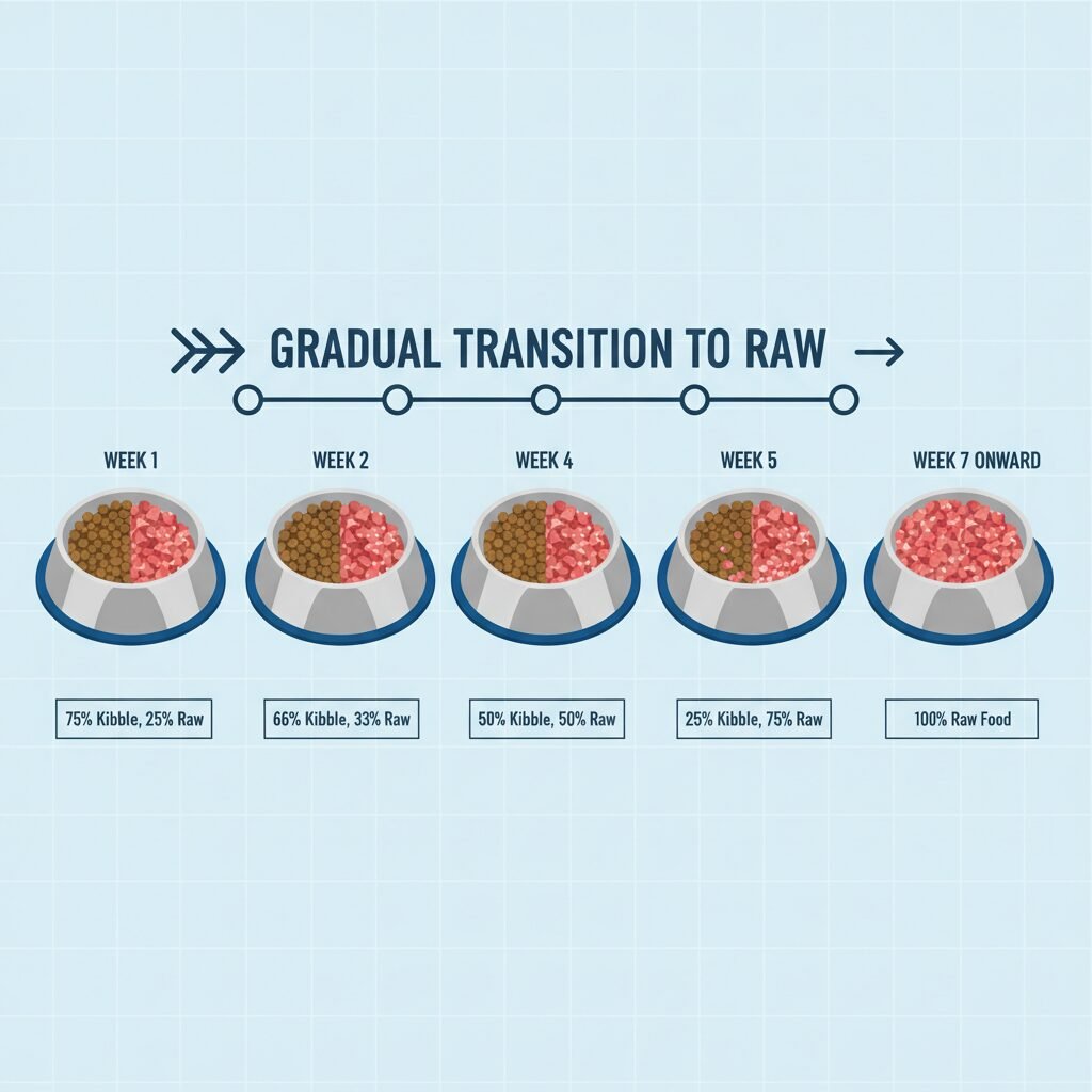 This method involves gradually introducing raw food while phasing out the old food over one to two weeks. This is the most gentle approach for a dog’s digestive system.