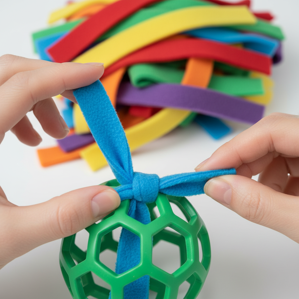 - Master the Knotting Technique: Take a single strip of fleece. Pass one end through a hole on the ball and out through an adjacent hole. Take the two ends of the fleece strip and tie a simple, single knot. Pull it snug against the surface of the ball. The goal is not to tie a double-knot that is impossible to undo, but a simple, secure knot that holds the fleece in place.
