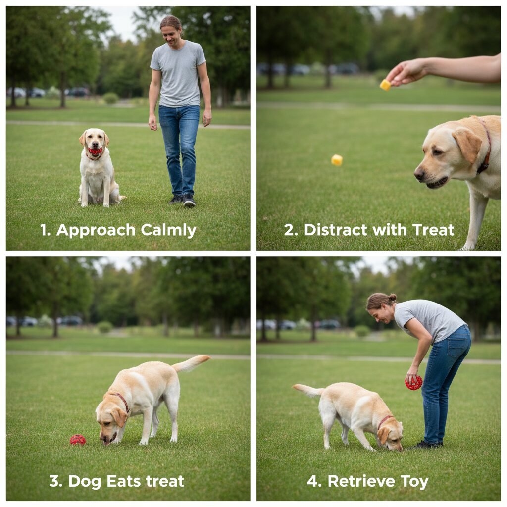 - Step 1: The Foundational Trade (Low-Value Items). Begin with an item your dog enjoys but does not actively guard. This could be a less-exciting chew toy or a simple rubber ball. Give the item to your dog. Let them settle with it for a moment. Approach them calmly, but stop before you enter their personal space (their ‘pressure zone’). Without saying anything, toss a few high-value treats (like pieces of chicken) on the floor a short distance away from them. The treats should be far enough that they must leave the item to get them. The moment they move away from the item to eat the treats, calmly walk over, pick up the item, and then immediately give it back to them. Repeat this 5-6 times and then end the session. The goal of this step is to establish a simple pattern: my human approaches, good things appear, and I always get my original item back.
