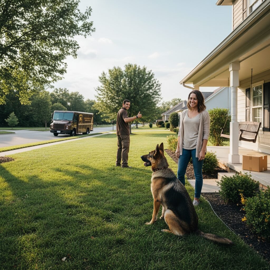 It is crucial to never allow the delivery driver to interact with your dog during this process. Their job is to deliver packages safely, not participate in your training. Your responsibility is to maintain a safe distance and control of your dog at all times.