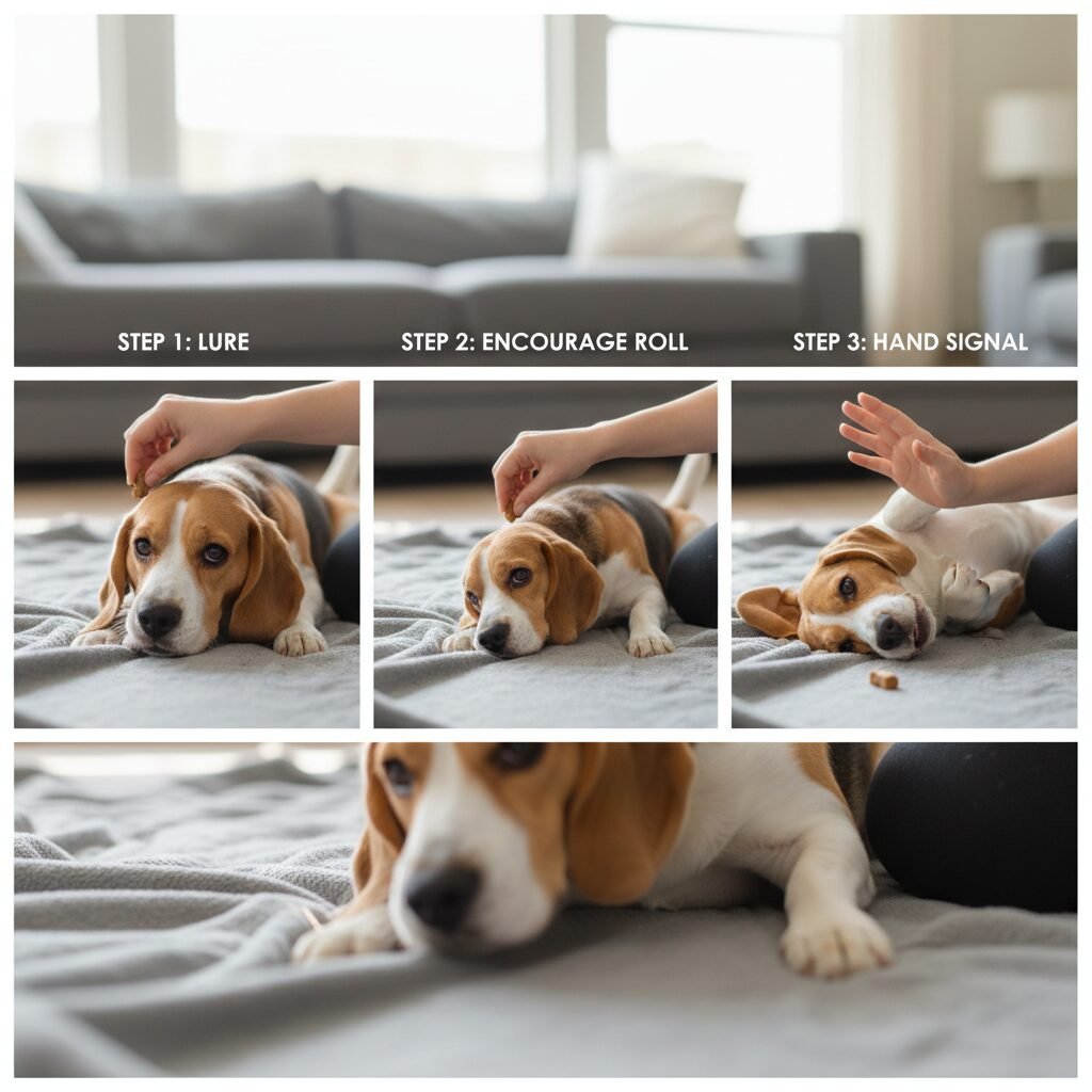Once your dog reliably moves onto its side, you can begin luring it through the full roll. This is often the most challenging step and requires patience.