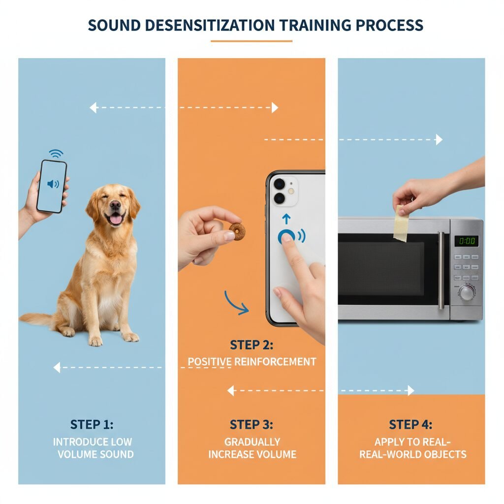- The Beep Recording: Use your phone to record the exact sound of your microwave beep. Alternatively, you can search online for ‘microwave beep sound effect.’ Using the specific sound your dog fears is most effective.