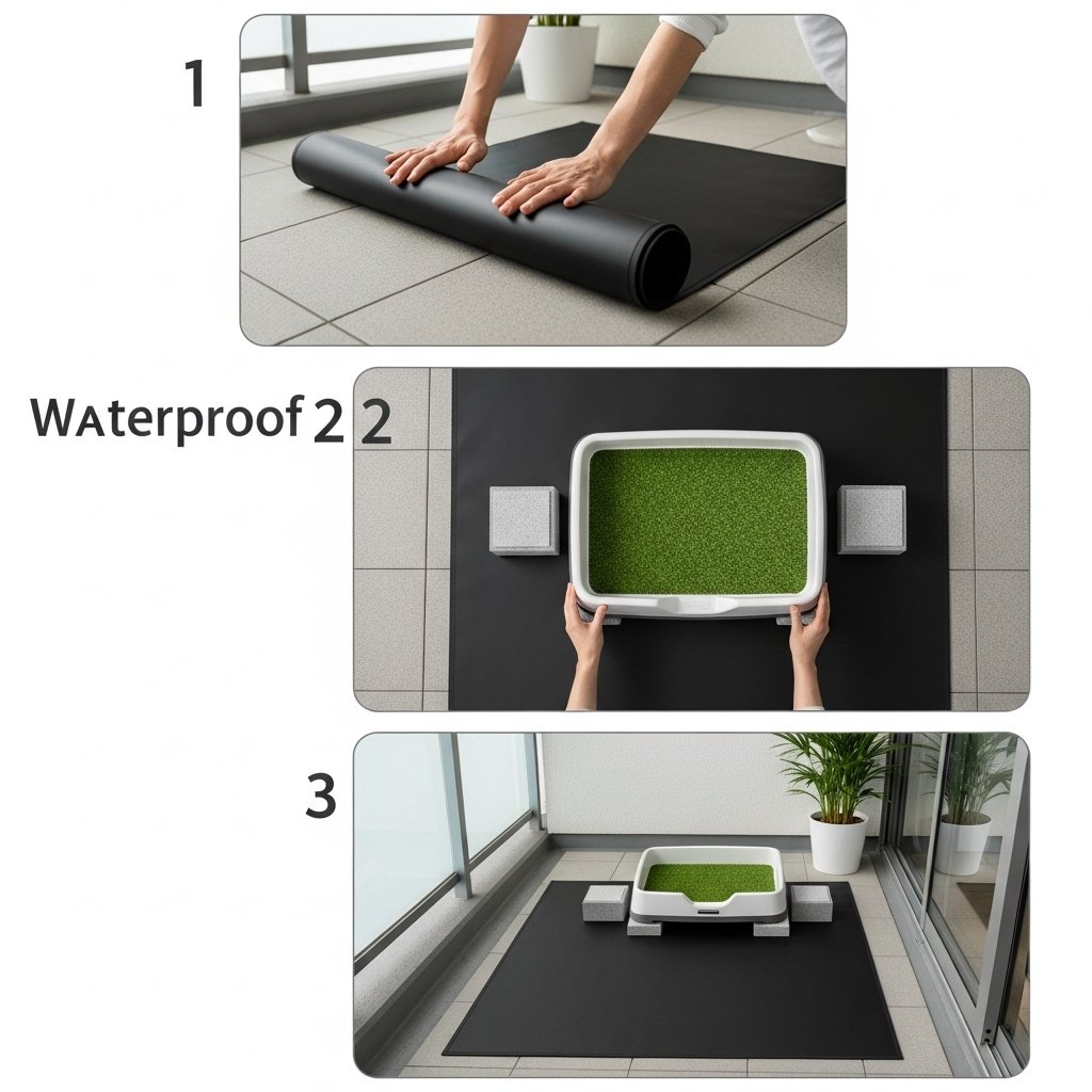 Before placing your potty system, lay down a waterproof barrier. A heavy-duty rubber mat, a sheet of vinyl flooring remnant, or even a shallow hard plastic tray (like a boot tray) can work. This layer serves two purposes: it protects your balcony from any potential leaks or splashes and it makes the entire area easier to clean.