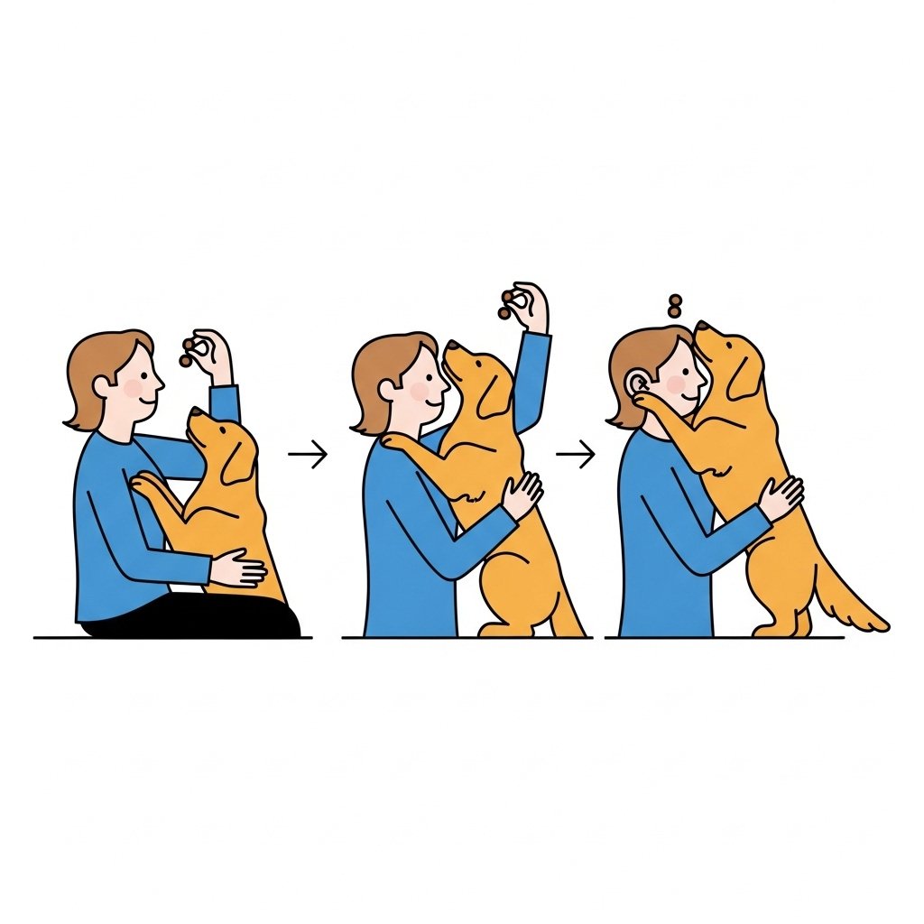 | My dog puts its paws on me but won’t ‘wrap’ or lean in. | The dog may be hesitant about the close contact. Re-evaluate their comfort level. If they seem comfortable, make the lure more enticing. Guide the treat in a more exaggerated arc around your neck so they have to stretch and lean to get it. Reward even the slightest lean-in at first. |
