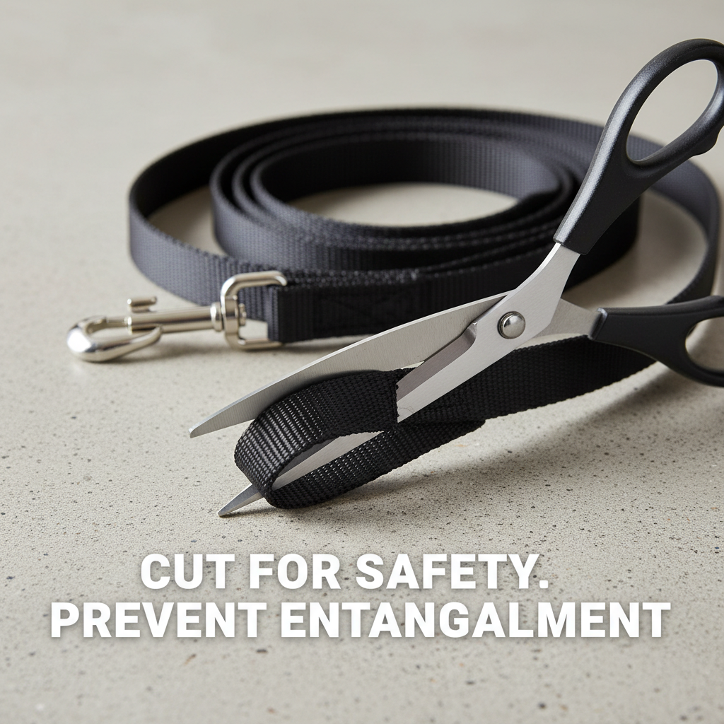 • Remove the Handle. Before its first use, take a sharp pair of scissors and cut the handle loop off the end of the leash. This single action dramatically reduces the risk of the line getting snagged on a cabinet handle, table leg, or other household object.