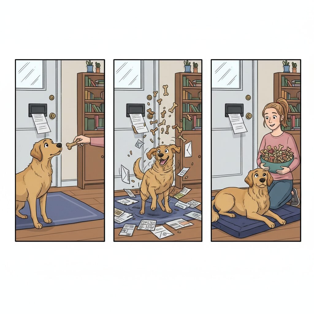 2. Reward for Calm: When the mail comes through the slot, calmly walk over to your dog (who should still be on their mat) and deliver a ‘jackpot’ reward—a stream of high-value treats, one after another, for their calm behavior. This is a higher-level reward than the treat party on the floor and reinforces their impulse control.