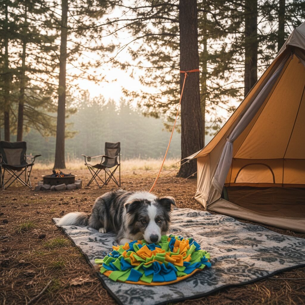 • Scent Work: Hide high-value treats around your campsite (within your dog’s tethered area) and let them use their nose to find them. This is a naturally calming and confidence-building exercise.