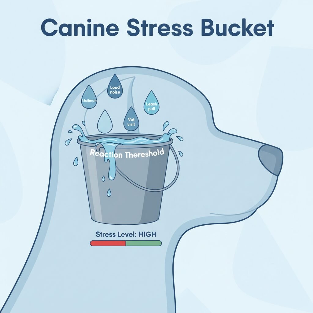 The problem arises when the dog is exposed to multiple stressors in succession without adequate time to recover. Each new trigger adds more stress hormones to a system that is already flooded. This is where the stress bucket analogy becomes so useful.