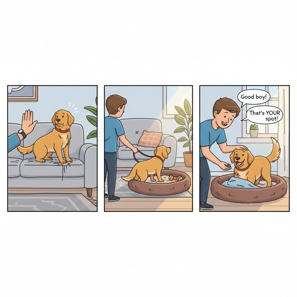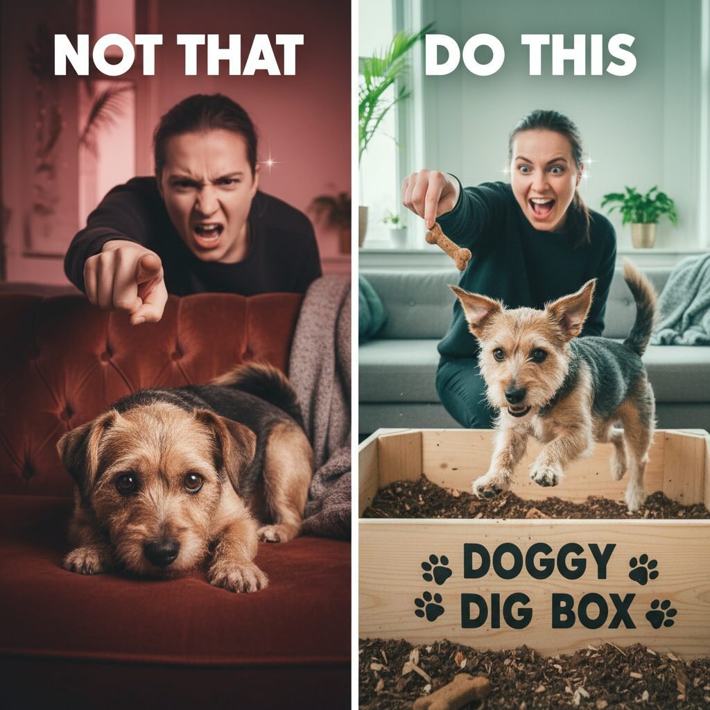 - Interrupt and Redirect: The moment you see your dog start to dig on the sofa, make a calm, neutral sound (like ‘Oops!’ or a clap) to interrupt them. Avoid yelling, which can create fear.