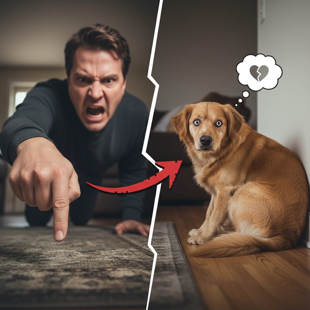 3. The owner’s posture stiffens, their voice becomes sharp, and they may point at the mess or the dog.